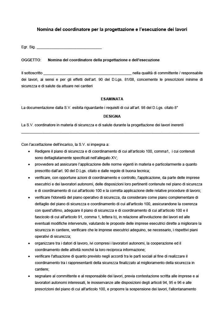Nomina del Coordinatore per la progettazione e l’esecuzione dei lavori